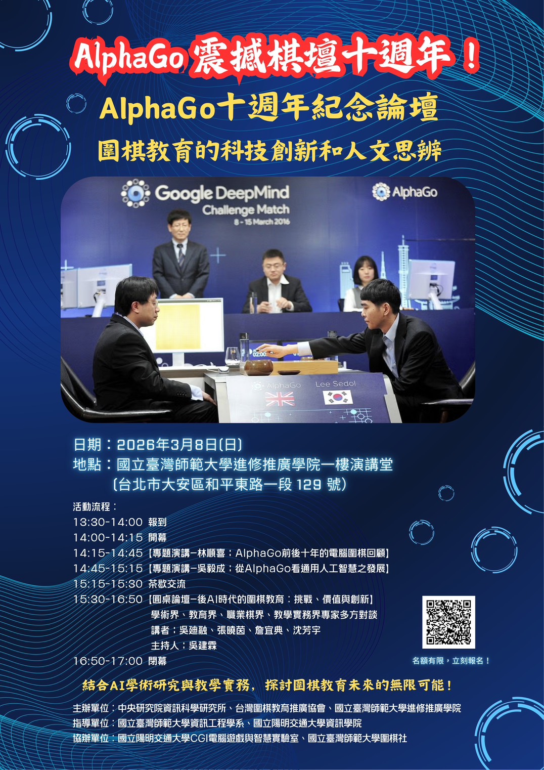 2016 年是全球人工智慧發展的里程碑,同時也象徵著圍棋教育進入「人機共存」的新紀元。今年為AlphaGo 震撼棋壇十週年,本活動旨在結合學術研究與教學實務,回顧這十年的變革,並探討未來 AI 輔助教育的無限可能。