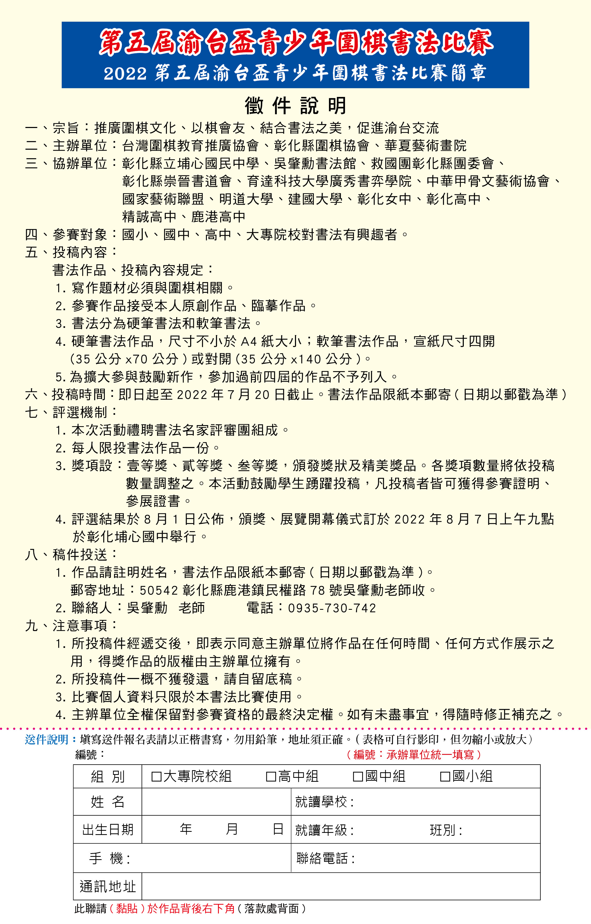 2022第五屆渝台盃青少年圍棋書法比賽徵件簡章 一、宗旨:推廣圍棋文化、以棋會友、結合書法之美,促進渝台交流 二、主辦單位:台灣圍棋教育推廣協會、彰化縣圍棋協會、華夏藝術畫院 三、協辦單位:彰化縣立埔心國民中學、吳肇勳書法館、救國團彰化團委會、彰化縣崇晉書道會、育達科技大學廣秀書弈學院、中華甲骨文藝術協會、國家藝術聯盟、明道大學、建國大學、彰化女中、彰化高中 四、參賽對象:國小、國中、高中、大專院校對書法有興趣者。 五、投稿內容: 書法作品、投稿內容規定: 1. 寫作題材必須與圍棋相關。 2. 參賽作品接受本人原創作品、臨摹作品。 3. 書法分為硬筆書法和軟筆書法。 4. 硬筆書法作品,尺寸不小於A4紙大小;軟筆書法作品,宣紙尺寸四開(35公分x70公分)或對開(35公分x140公分)。 5.為擴大參與鼓勵新作,參加過前四屆的作品不予列入。 六、投稿時間:即日起至2022年7月20日截止。書法作品須原作郵寄(日期以郵戳為準)。