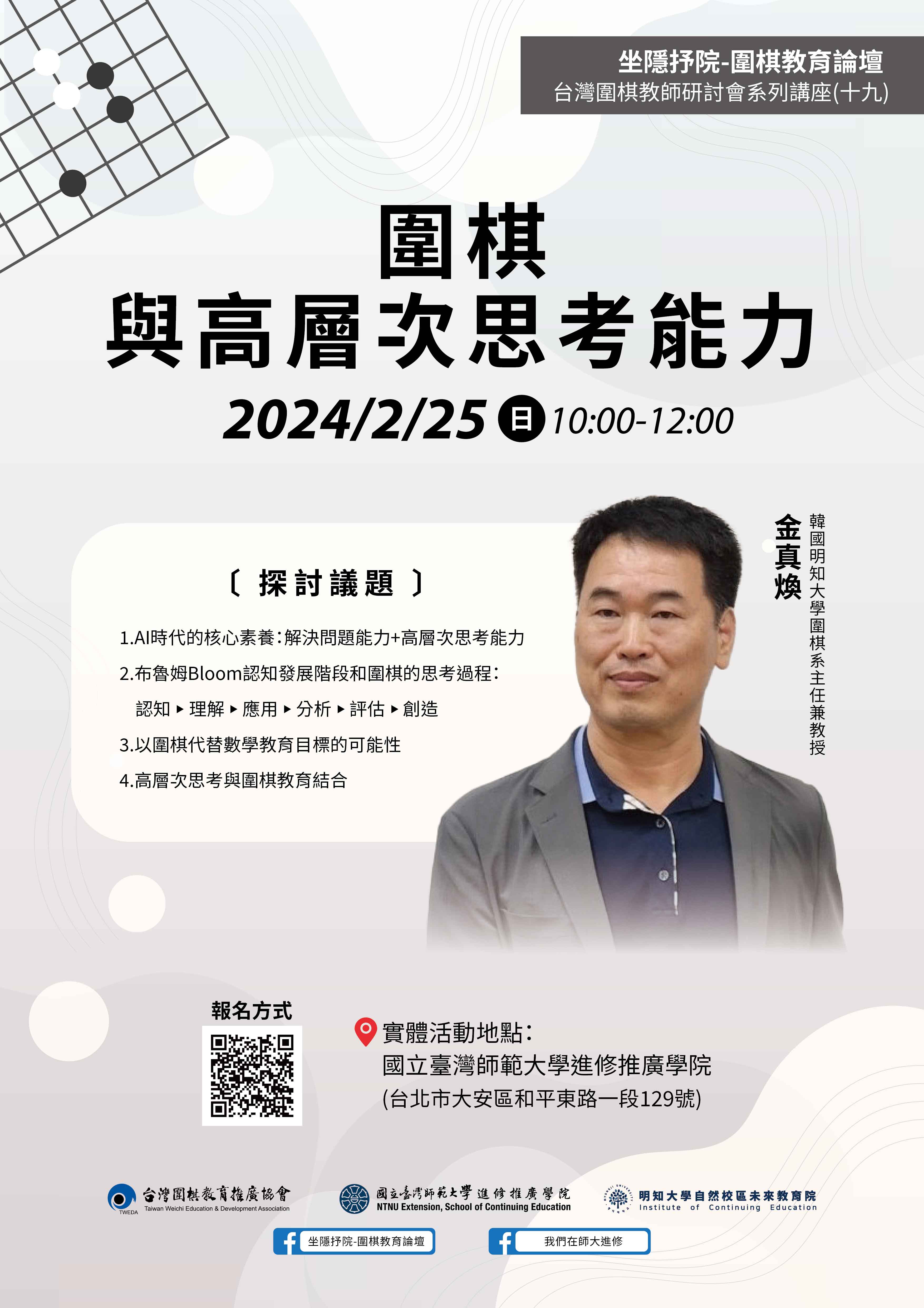 韓國明知大學為世界唯一設有圍棋系的大學,並設有碩士、博士學位,為圍棋學術研究的最高殿堂。本講座由國立臺灣師範大學進修推廣學院、台灣圍棋教育推廣協會、韓國明知大學未來教育院共同主辦,邀請到明知大學圍棋系主任金真煥教授蒞臨演講,結合教育理論與圍棋教育,說明為何圍棋有助於培養高層次思考及解決問題的能力。